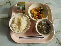 今日の給食は、米飯、牛乳、鶏肉と厚揚げの甘辛炒め、けんちん汁でした。