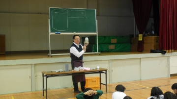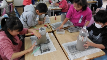 3年生の社会科では四日市の伝統工芸について学習しています。今日は萬古陶磁器工業協同組合のご協力により、ランプシェードづくりに挑戦しました。まずは体育館で作り方を教えていただき、その後各教室に戻ってランプシェードを作りました。最初は1枚の板の粘土をペットボトルなどの筒に巻き付け、クッキーの型や貝殻で形をくりぬいたり模様を付けたりして仕上げました。今日作った作品は、ばんこの里会館へ持ち帰っていただき、素焼きと本焼きをした上で、来月には届けていただく予定です。どんな作品に仕上がってくるのか楽しみです。学級閉鎖している1組や今日休んでいる子については、20日以降に作品つくりに取り組む予定です。