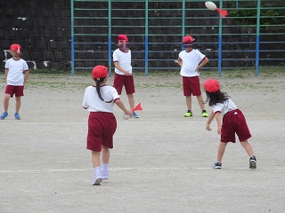 屋外での体育授業です。この時期は、お天気と相談。梅雨の合間を縫うように外での体育が行われます。今日は、器具(ジャベリックボール)を使ってボールの投球練習です。向かい合った相手に向けて投球です。正しい体の使い方をすると、器具はまっすぐストーンと飛んでくれます。