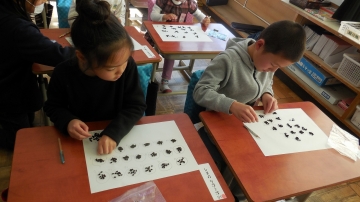 1年生では大きな数の学習が始まりました。今日はその導入の授業です。大きな数といっても、何を子どもたちに数えさせるのか、授業者の考えどころです。今回は1学期に育てた朝顔の種を数えることにしました。自分で育てた朝顔の種です。一つずつ大切にに10のまとまりを作りながら数えていました。そして100を超えたところで、自然と100を超える数について学習することができました。