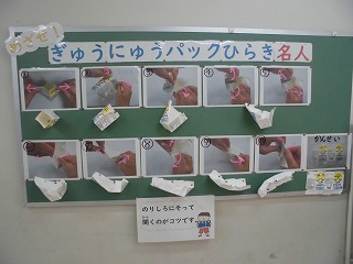 中央廊下には、本物の牛乳パックを使って、開き方が見てわかるように掲示が張られています。今、1年生の子どもたちは牛乳パックをうまく開けるように毎日頑張っています。日に日にうまく開けれる子が増えてきました。