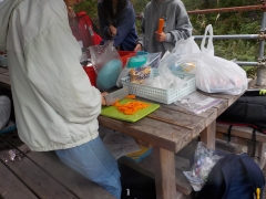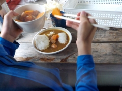 カレーよりも薄く野菜を切り、袋に入れて湯で温めていきました。ご飯も袋に水を入れて作りました。袋に入れたカレーがあるなどハプニングもありましたが、自分のカレーやご飯の袋2袋をお皿に入れておいしくいただきました。