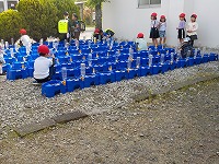 朝から体育館横にあるアサガオの植木鉢に子どもたちが水をあげていました。
