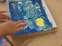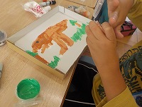 図工の時間、絵の具を使ってかわいい絵を描いていました。きれいな色をつくり色を塗っていくのが楽しい様子でした。