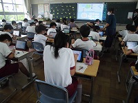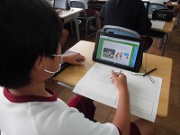5年生がタブレットを使って、総合の学習の時間に世界の国々について調べていました。子どもたちの中には4年生では使ったことがない子もいて、「初めてタブレットを使ったけど、簡単で使いやすかった。いろいろ調べることができてよかった」と、好評でした。