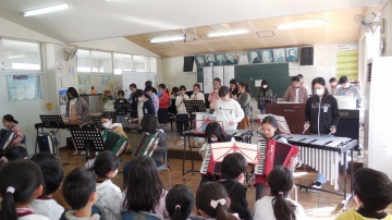 今日の20分休み、音楽室で合奏クラブの発表会がありました。今回はアラジンの「Whole New World ホールニューワールド」と海猿の「Courageカレッジ」の2曲です。ピアニカやリコーダーだけでなく、アコーディオンや木琴・鉄琴・ドラムなどいろいろな楽器を使って演奏しました。クラブは年に5回予定していますが、休み時間も自主練習に取り組むなど、一人ひとりがよく練習し、今日の発表会を迎えたそうです。たくさんの児童が音楽室に集まり、楽器の演奏に聴き入っていました。