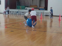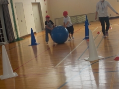 やまびこ学級で体育館で体育をしていました。10月1日には、三泗地区の特別支援学級の子どもたちは、三泗特別支援学級連合運動会に参加します。子どもたちが出場する大玉ころがしの競技を練習していました。