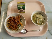 今日の給食は肉みそビビンバ、牛乳、ワンタンスープでした。