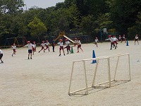 体育の時間、運動場でリレーのバトンパスをスムーズにつないで、速さを落とさずに走り切るよう課題を提示して取り組んでいました。