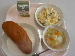 今日の給食は、黒糖パン、、牛乳、ポテトグラタン、野菜スープでした。ポテトグラタンには、ブロッコリーや鶏肉などが入り、栄養たっぷりであつあつメニューでおいしくいただきました。