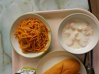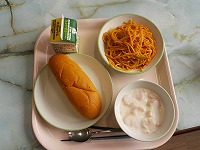 今日の給食は地物一番給食でした。小型玄米パン、牛乳、三重豚のトマトスパゲッティ、フルーツヨーグルトでした。