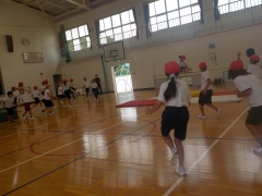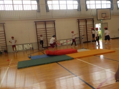 体育の時間、走り高跳びを体育館で行いました。自分が目標にしている高さを跳び越えるためにグループで跳び方を観察しながら何回もチャレンジしていました。