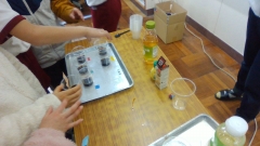「何種類かの液体(食塩水、しょうゆ、お酒、お酢)に重曹を混ぜるとどうなるか」の実験をしていました。実はお酢と重曹を混ぜるとビールのように泡立ちます。それはアルカリと酸が反応するからなのです(一般家庭でも泡洗浄として使用されていて体に大きな影響はありません)。子どもたちは、その不思議な現象にびっくり。なんで?どうして?が課題探求の大きな原動力になるんですね。いろんな不思議と出会ってほしいと思います。