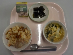 今日の給食は、とり飯、牛乳、地物たっぷりかきたま汁、手作り伊勢茶ゼリーでした。今日は地物一番メニューでした。かきたま汁の白菜、小松菜、大根、とり飯の米と鶏肉、伊勢茶ゼリーの伊勢茶は四日市産でした。