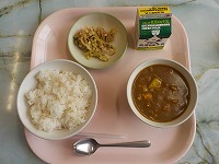 今日の給食は、米飯、牛乳、チキンカレー、チーズ入りツナサラダでした。