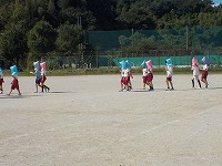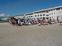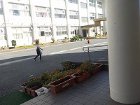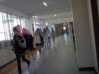 20分休み緊急地震速報が流れました。子どもたちは運動場の中央に集まったり、頭を守ったりしました。そして揺れが収まり、地震の影響で給食室が火事になったという想定で避難しました。