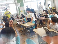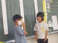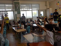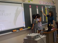 国語の時間「どうやってみをまものかな」という説明文を学習しています。教科書には載っていないエリマキトカゲの身の守り方について写真から考えました。エリマキを広げて身を守ります。子どもたちのそのことについてペアで話し合いながら考えて発表しました。ペアで前に出てきて説明したい部分を指差して発表する姿は大変意欲的で心強く感じました。ペアでしっかり考えて課題解決に向けて考え合う姿が見られ、1年生の成長を感じました。