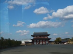 法隆寺から東大寺に移動中、平城京跡を車中から見学しました。遣唐使の船が飾られるなど平城京の様子がわかる場所です。1300年以上前にこのような都をつくることができた人の力のすばらしさを感じることができました。
