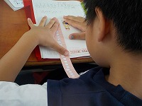 官製はがきの長さをみんなが測っていました。15㎝よりも長く、16㎝よりも短いようです。子どもたちの持っているものでは、測れないので、定規が登場しました。1㎝の間に10個のメモリがあります。はがきを測ると間のメモリのところまでで測れそうです。新しい単位の㎜の学習に入ります。長さの単位を習得することで身の回りの長さを測れるようになっていってほしいと思います。