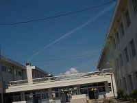 今日は朝から久しぶりに青空が広がりました。昼間は暑くなりそうです。校舎の上を飛行機が横切ったようで、きれいな飛行機雲ができていました。