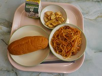 今日の給食は、小型玄米パン、牛乳、イタリアンスパゲッティ、サツマイモチップスでした。