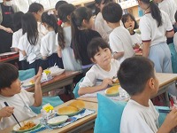 子どもたちは口の周りを赤くしながらイタリアンスパゲッティを食べている子もいました。今日も暑い一日となりました。給食をしっかりいただき、夏バテしないように体力をつけていってほしいと思います。