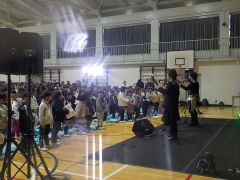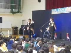 3限目、体育館で学び舎音楽会を行いました。四日市市出身の三味線ブラザーズKUNI-KEN バンドの皆さんにお越しいただき、三味線での素敵な演奏を聞かせていただきました。