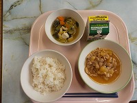 今日の給食は、米飯、牛乳、鶏肉の照り煮、具だくさんすまし汁でした。今日で6月の給食も終了です。