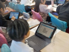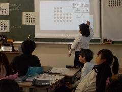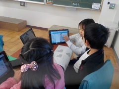 子どもたち同士、考えた方法をタブレットで共有して考えました。分けて足す方法や箱全体のチョコレートの数から食べた分を引く方法など子どもたちは様々な方法を考えて式で表すことができました。