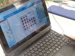 子どもたちは、タブレットを使ってチョコレートを並び替えて3×8や4×6という式を導き出して計算していました。