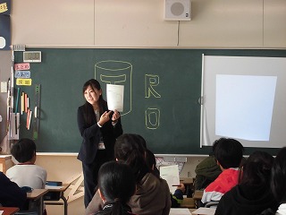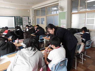 今日は常磐中学校から美術の平山先生に来ていただき、6年生に授業をしていただきました。「マグカップにデザインをしよう」ということで、マグカップの曲面に合わせてアルファベットでデザインをしました。小学生バージョンで、練習用の方眼を用意していただきましたが、「中学校に来たら練習用はないよ。」と中学校の授業を意識できるようにお話をしていただきました。アルファベットに模様をつけたり、配置を考えたりして、思い思いのデザインができました。