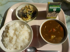 今日の給食は、米飯、牛乳、チキンカレー、海藻サラダでした。今日は子どもたちの大好きなカレーでした。1年生では、カレーを全員お代わりしていたようで、ご飯にかけてカレーライスでおいしくいただきました。