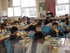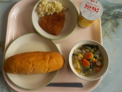 今日の給食は、米粉パン、発酵乳、アジフライ、マカロニサラダ、白菜スープでした。今日のスープには白菜がたっぷり入っていて栄養たっぷりでした。冬は白菜がたっぷり入った温かいもので体を暖めていきたいですね。