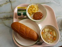 今日の給食は、黒糖パン、牛乳、煮込みハンバーグ、コンソメスープ、コーンソテーでした。