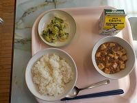 今日の給食は、米飯、牛乳、麻婆豆腐、ナムルでした。