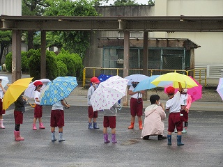 1年生の学級が「雨の日たんけん」に出かけようとしているところでした。