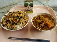 今日の給食は、ツナの三食丼、牛乳、地物たっぷり豚汁でした。