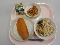 今日の給食は、小型玄米パン、牛乳、しのだうどん、小魚入りフライビーンズでした。
