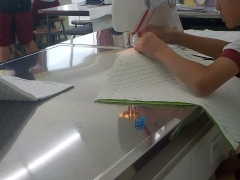 糸がまっすぐ進まなかったり、思うように縫えなかったりしていましたが、友達と教え合いながら作業を進める姿が見られました。
