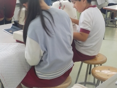 家庭科室で子どもたちがミシンを使ってナップザックを作っていました。ミシンを使って縫っていく作業は子どもたちも一苦労!