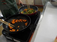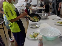 家庭の時間、調理実習で野菜炒めをつくりました。家庭科室からいい香りがして、学校探検をしていた1年生も立ち止まってしまいました。