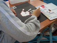 図工の時間、画用紙に手型をとり、その周りを綿棒で色をつけながらグラデーションできれいなデザイン画をつくっていました。