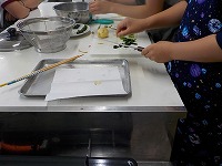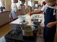 家庭科室で子どもたちが調理実習に取り組んでいました。ホウレンソウやジャガイモをゆでて調理しています。