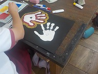 図工の時間、手形をとって、手形の周りにグラデーションを意識しながら綿棒で色付けをして作品をつくっています。