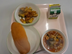 今日の給食は、米粉パン、牛乳、いかと野菜のレモン風味あげ、ミネストローネでした。