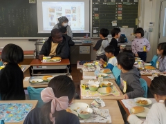 1年生は、HEFの先生といっしょに楽しくお話をしながら楽しく食べました。今日もおいしくいただきました。