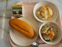 今日の給食は、米粉パン、牛乳、豆乳グラタン、キャベツのスープでした。