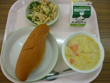 今日の給食は、黒糖パン、牛乳、コーンシチュー、ブロッコリーサラダでした。今日は昨日よりも気温が低くコーンシチューが暖かくおいしくいただきました。コーンシチューに入っている野菜とともにブロッコリーサラダで栄養をたっぷり摂ることができました。