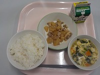 今日の給食は、米飯、牛乳、鶏肉の照り煮、かきたま汁でした。