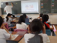 外国語活動の時間「今何時、その時間に何をしている?」という表現を聞きながら友達同士で質問をしていました。
